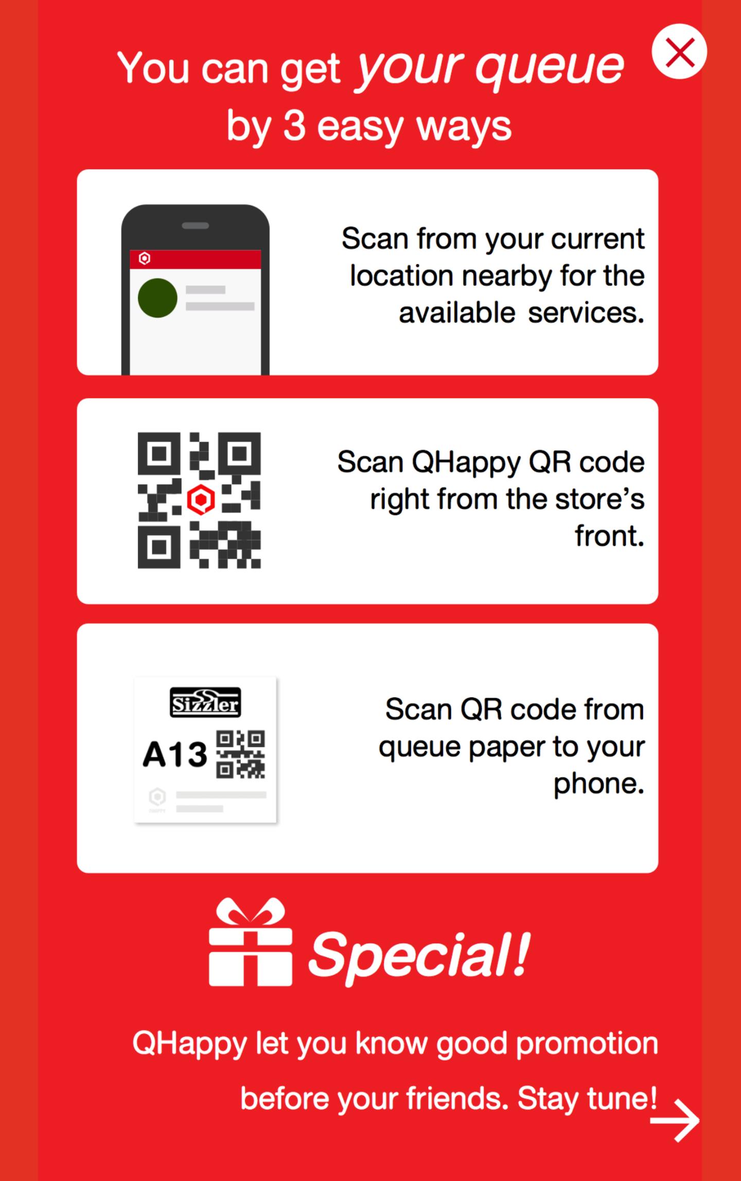 QHappy é um aplicativo que lhe dá liberdade para ir a qualquer outro lugar enquanto espera na fila. Digitalize o código QR da loja com QHappy para obter um número de fila e rastrear seu status com seu smartphone: D